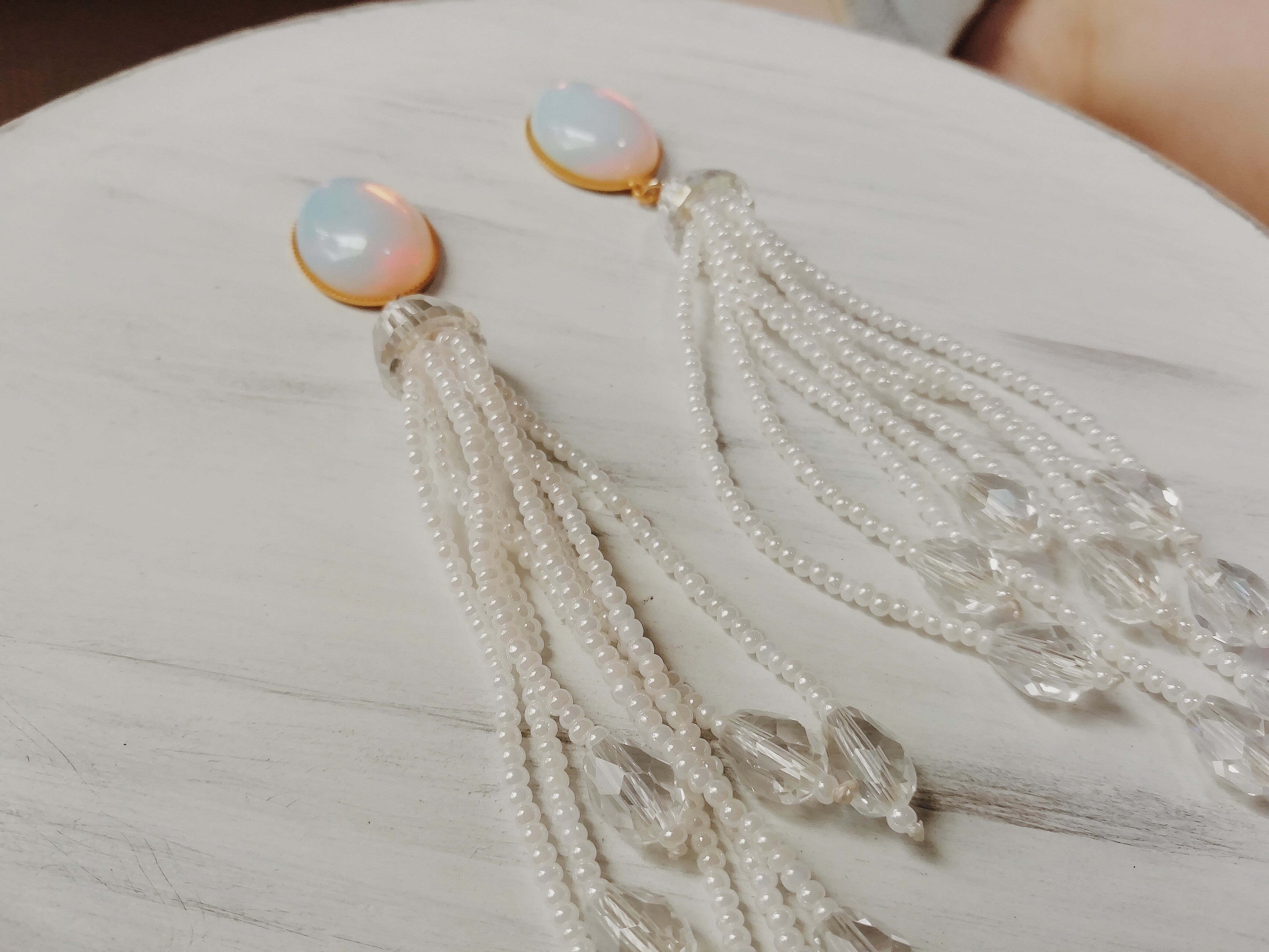ホワイトビーズタッセルの耳飾り